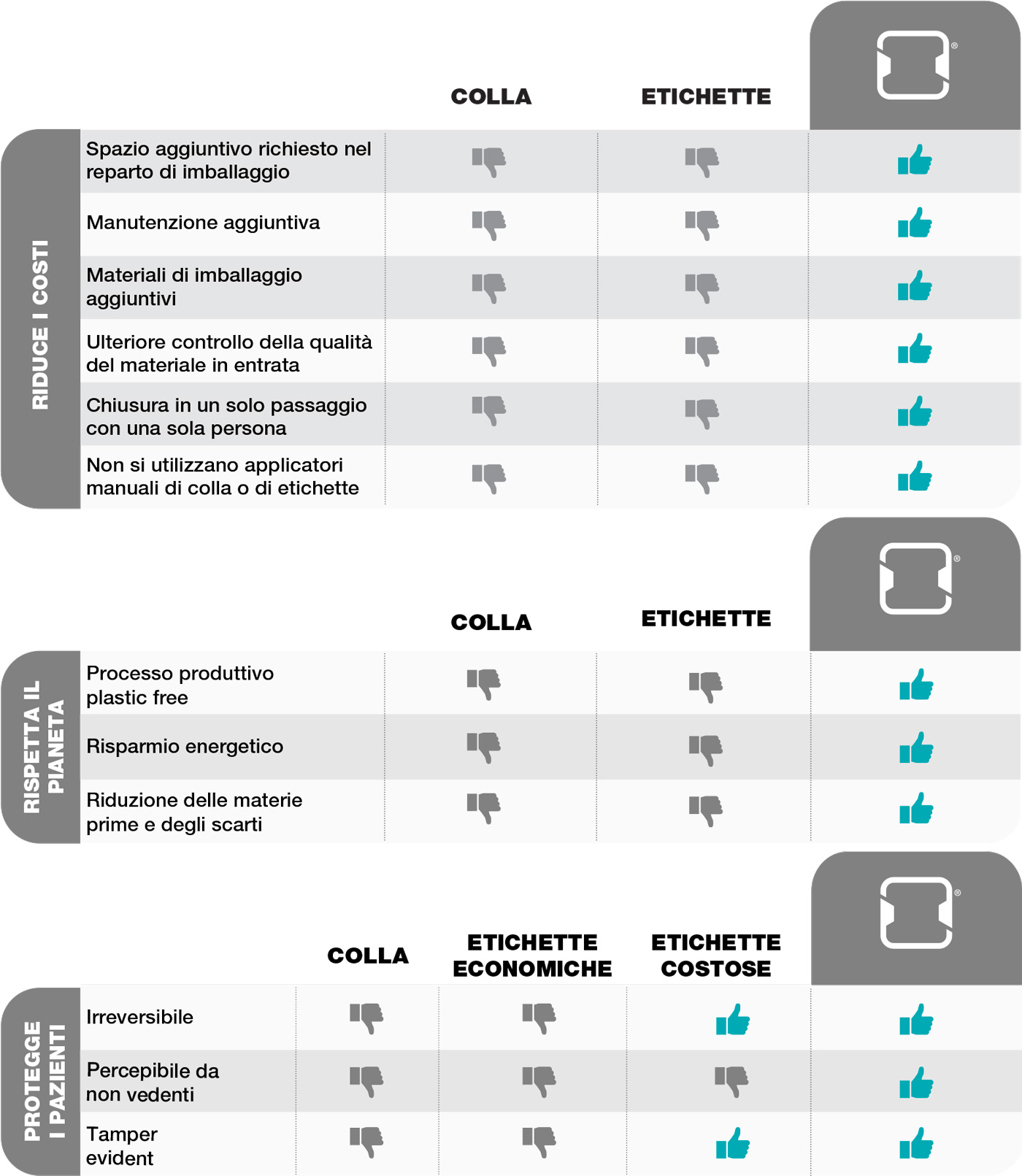 TECOBOX offre una sicurezza superiore rispetto ad altre soluzioni: le sigillature a colla possono essere aggirate riscaldando gli astucci, mentre le etichette possono essere rimosse e ri-applicate senza lasciare tracce evidenti.